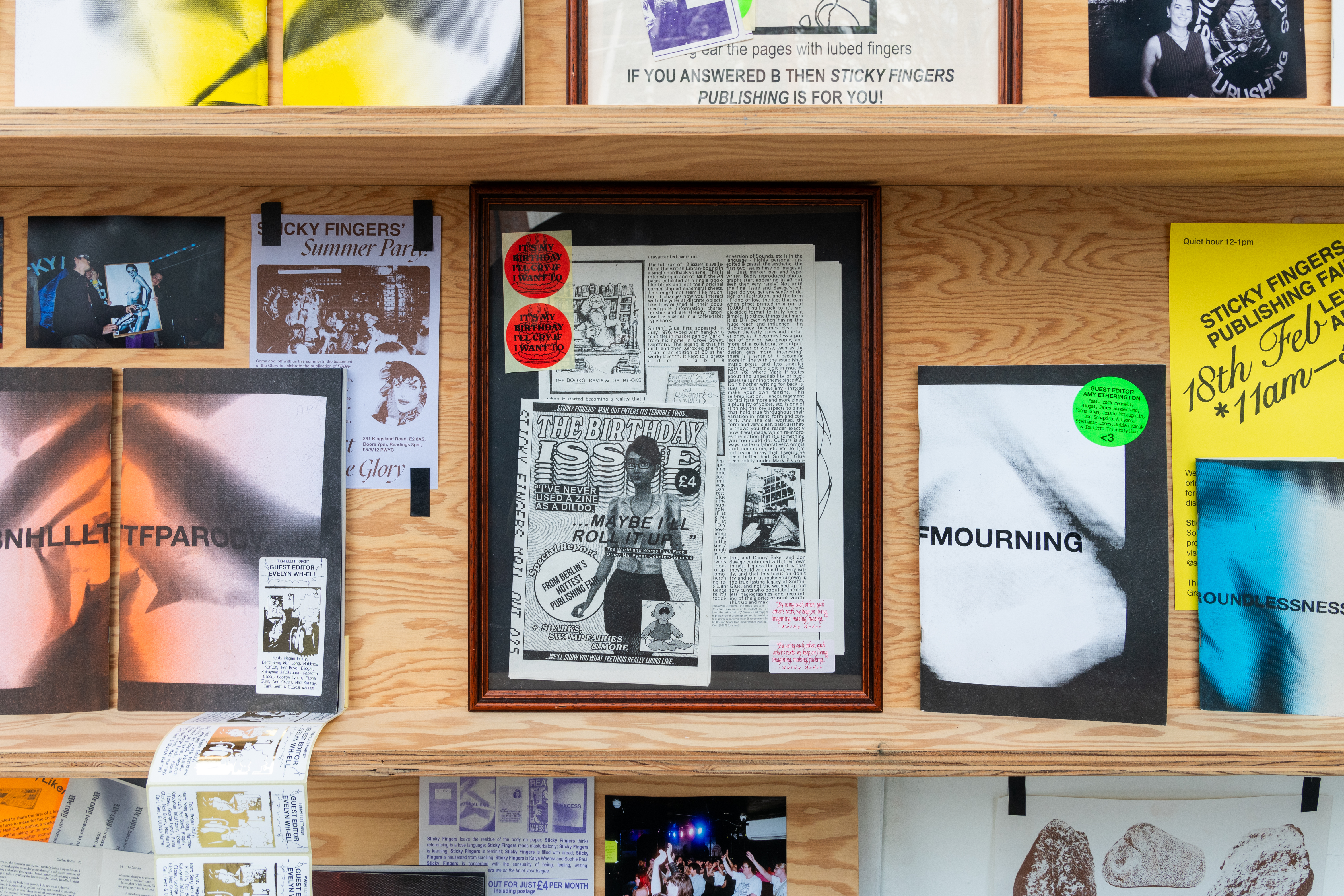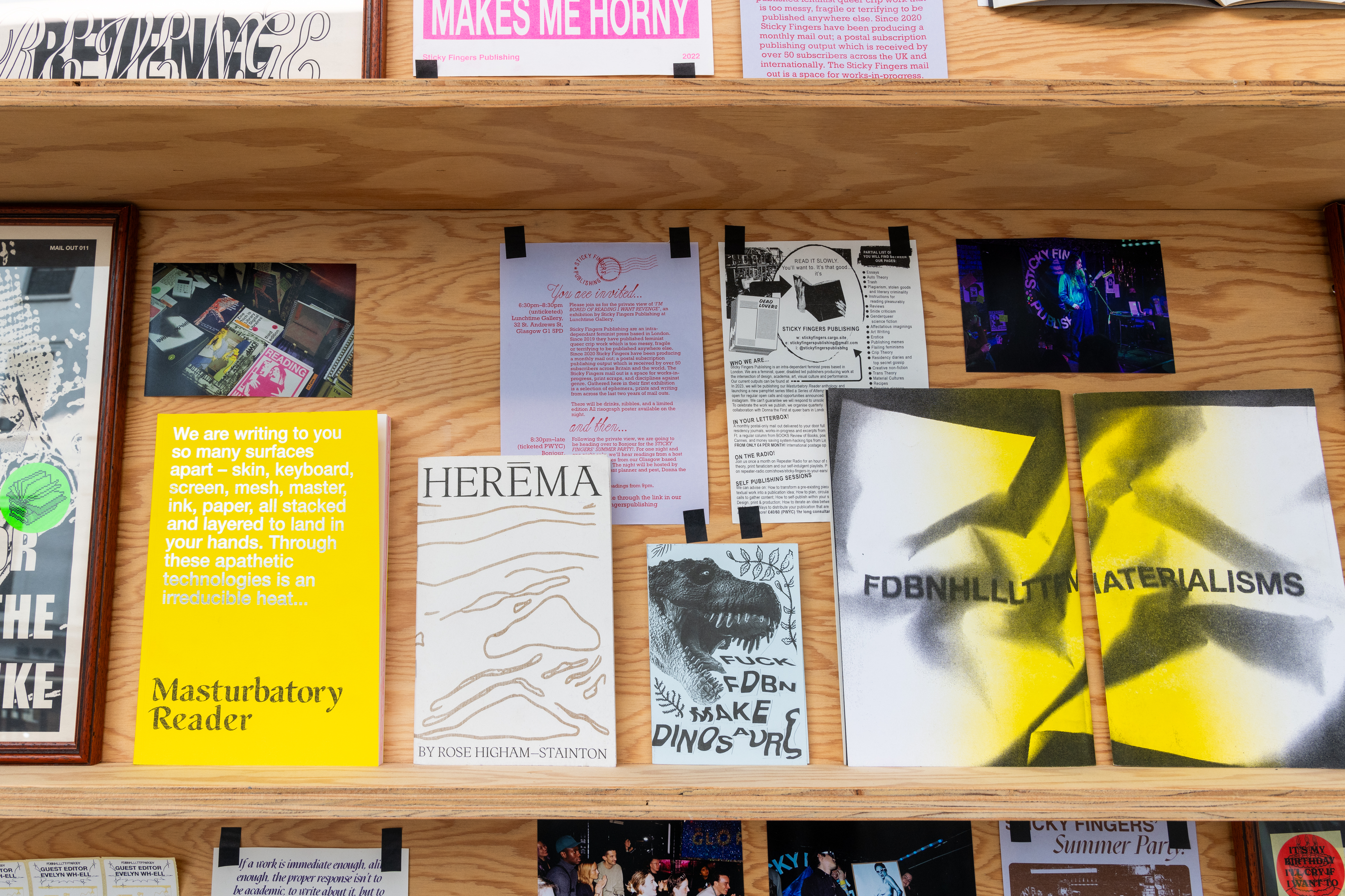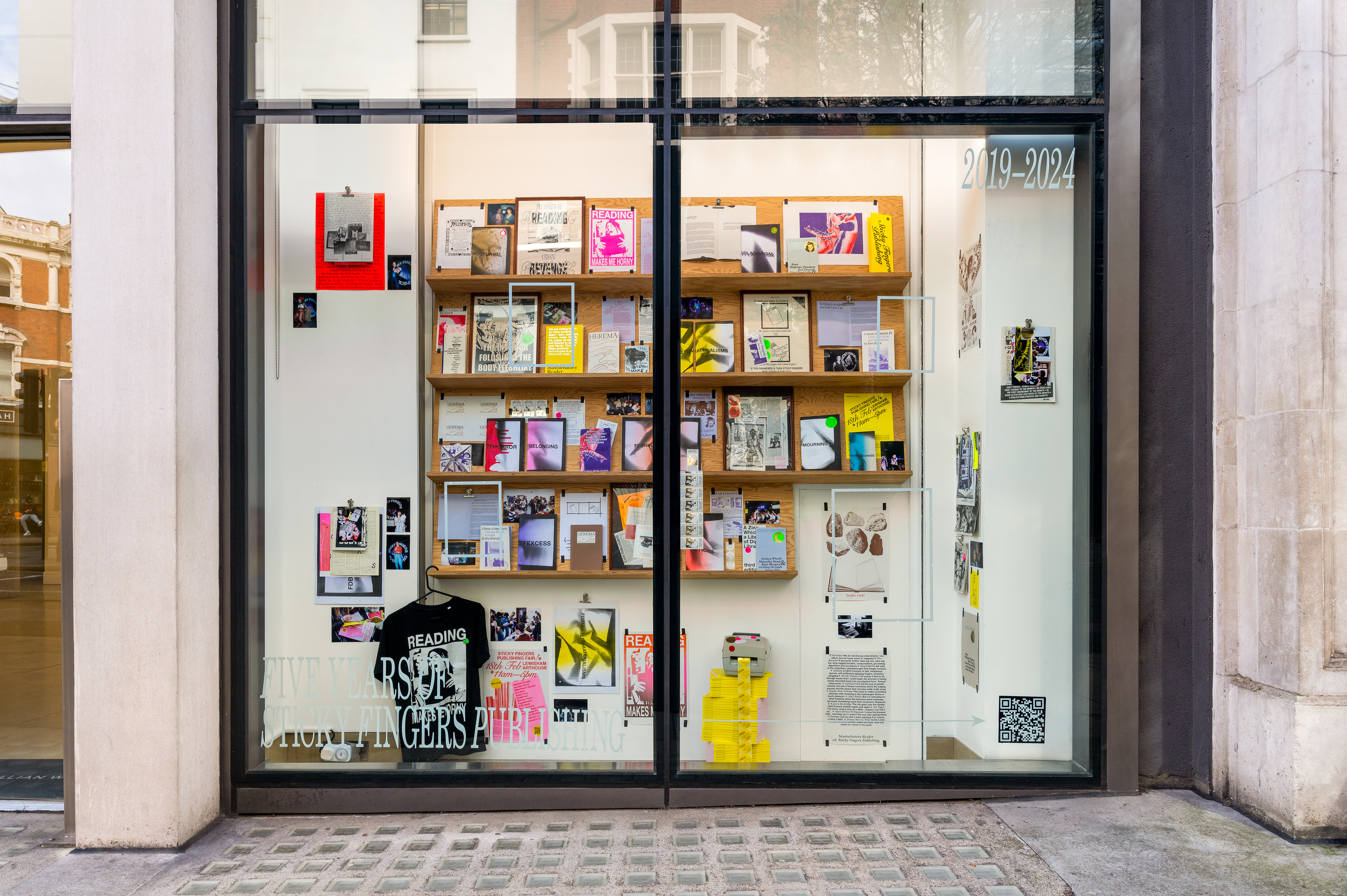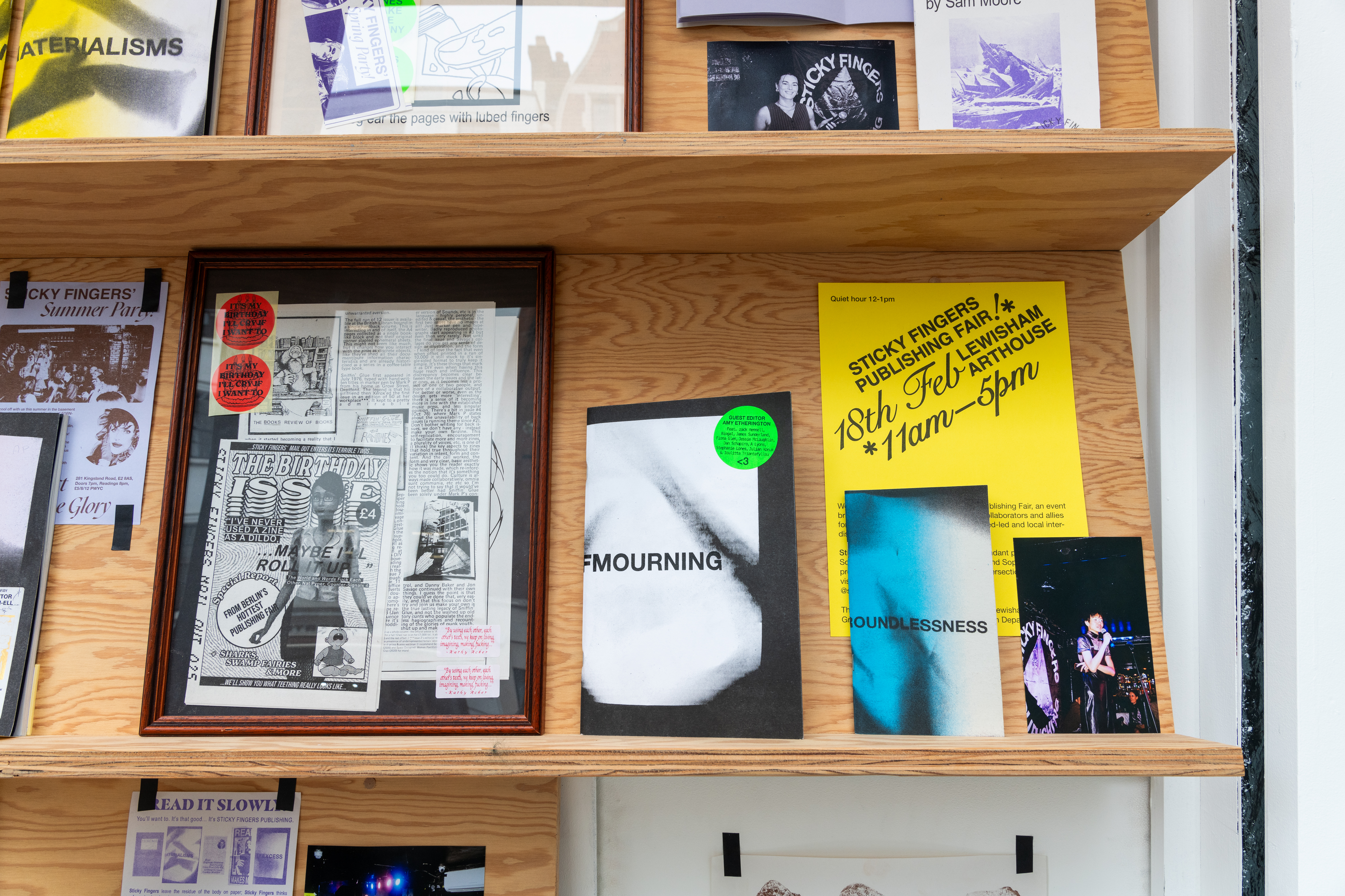 ‘Five Years of Sticky Fingers Publishing’ was a retrospective of the first five years of Sticky Fingers Publishing’s activities, and was shown as Maximillian William Gallery’s window exhibition ‘The Shelf’. The display included our whole back-catalogue of publications, a monthly risograph printed mail out, event ephemera such as posters and flyers, test prints, the residue of party games, open call posters, fair signage and our banner, stickers, film photographs, studio notes and lists.