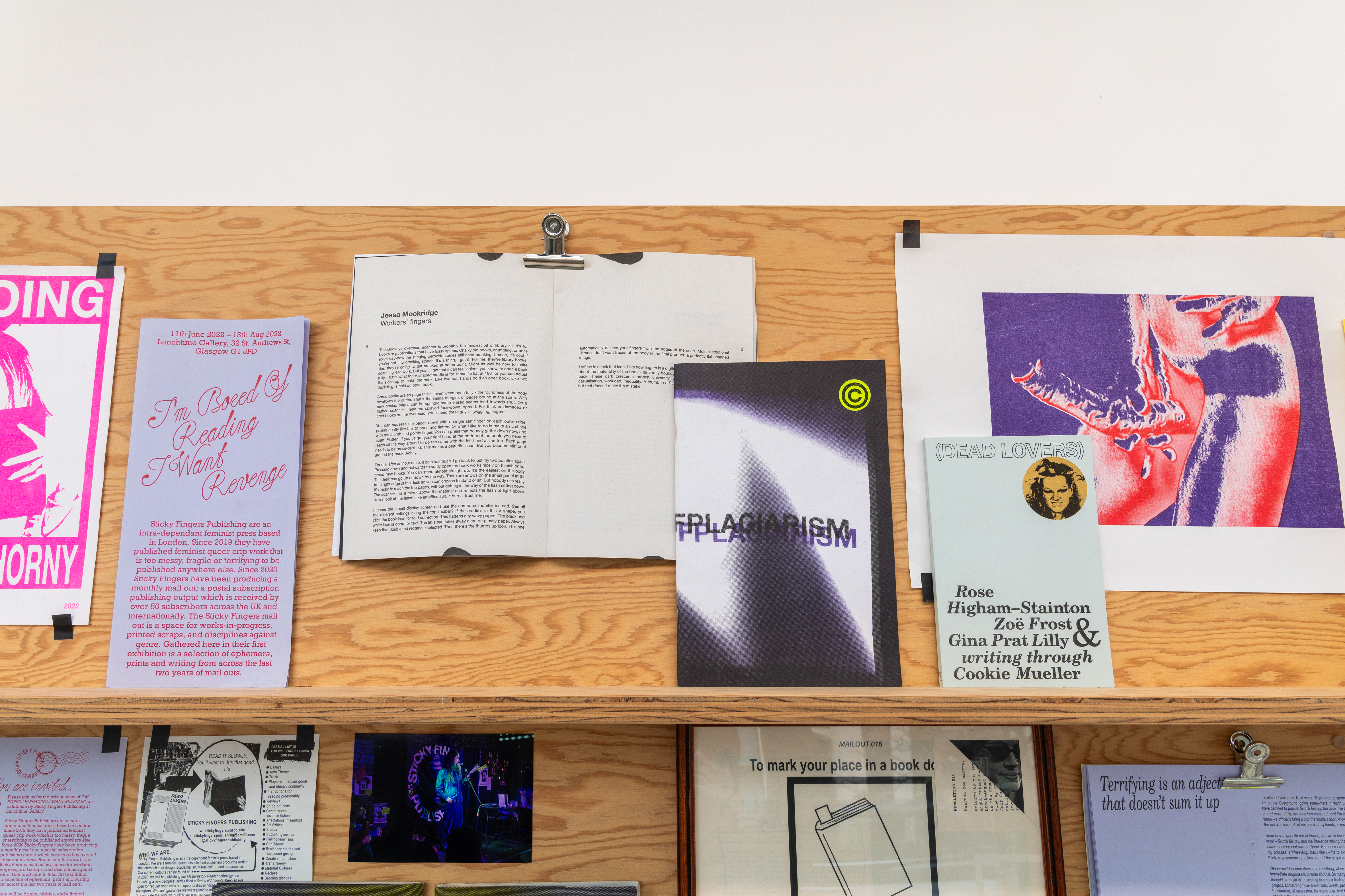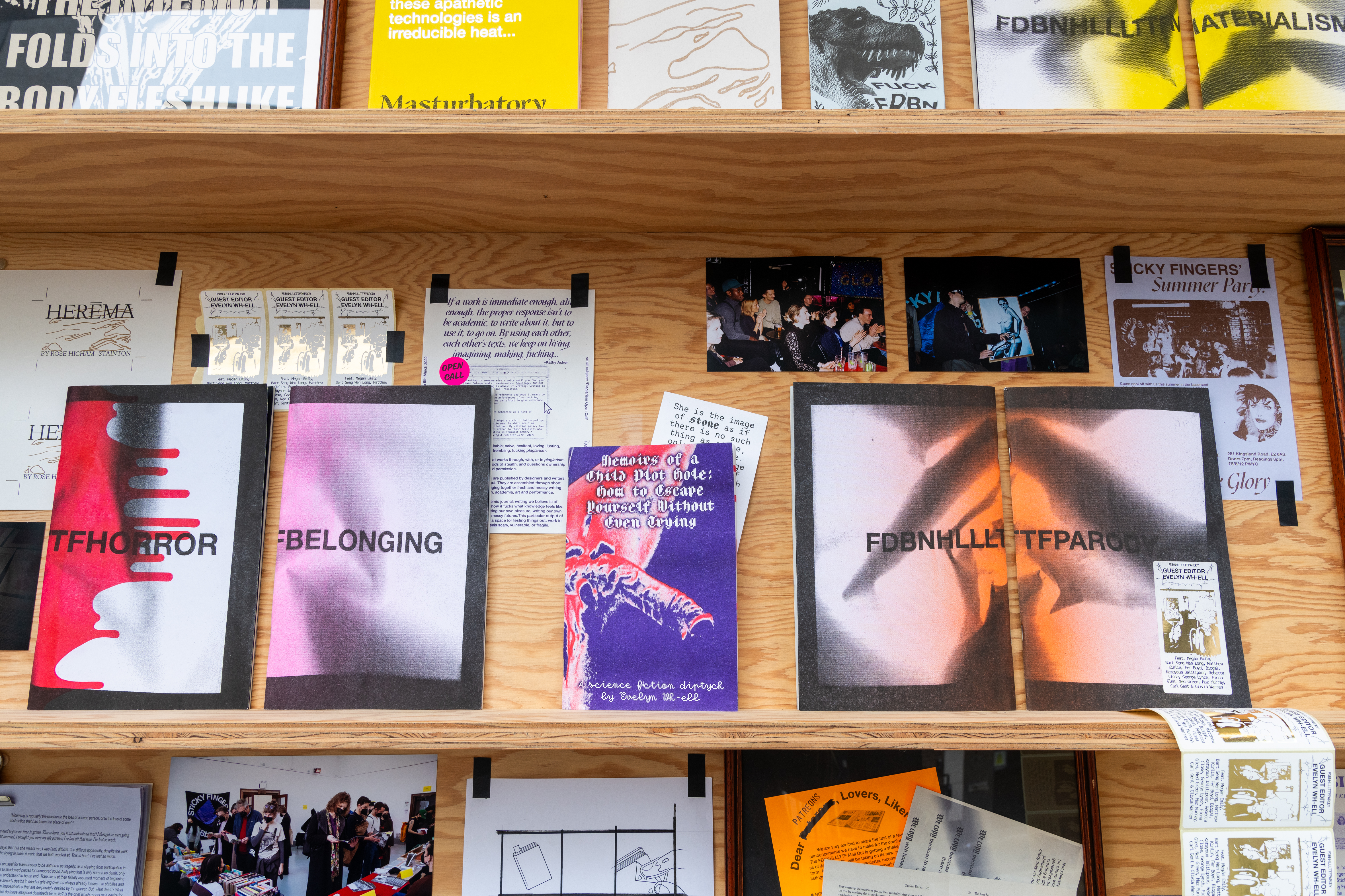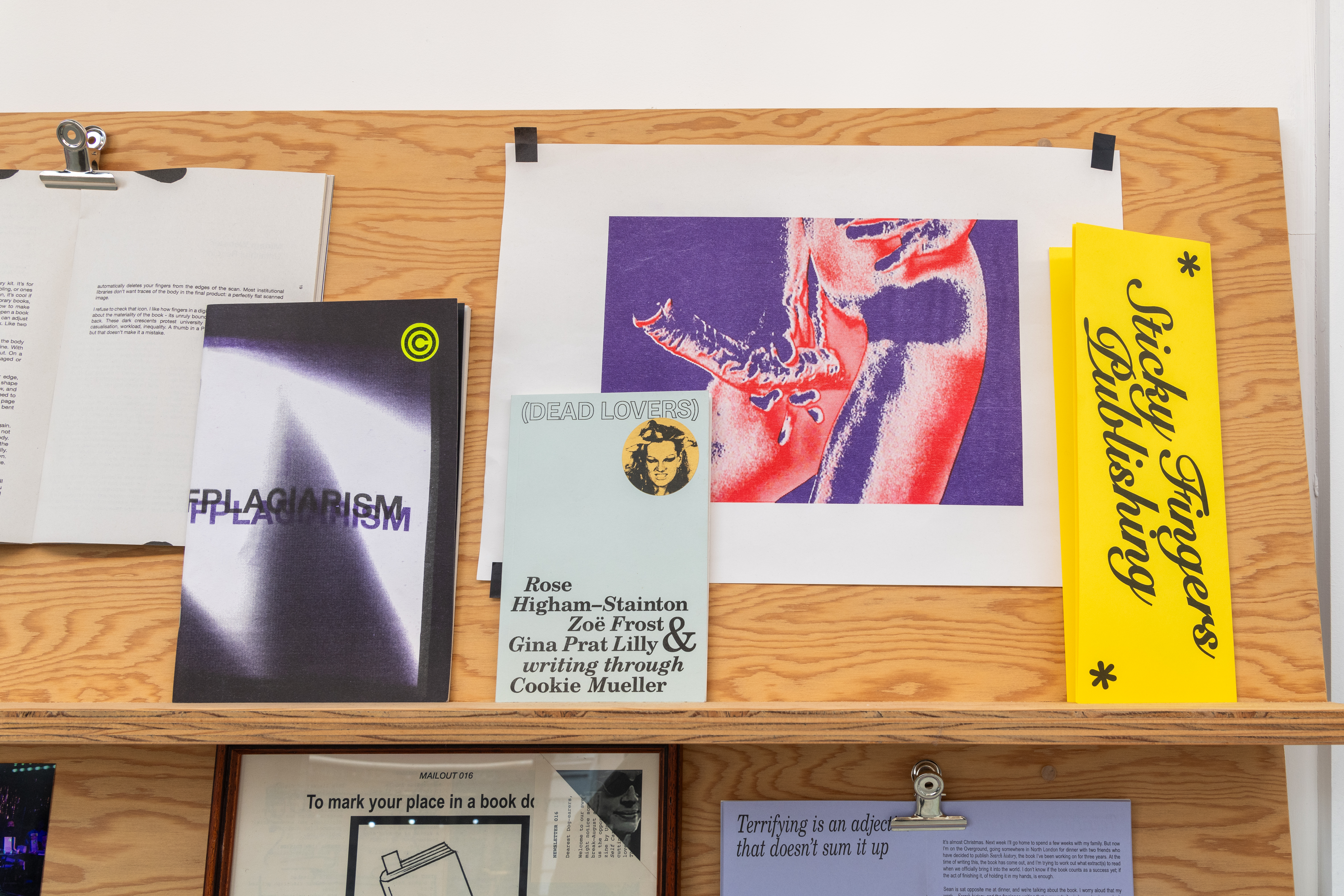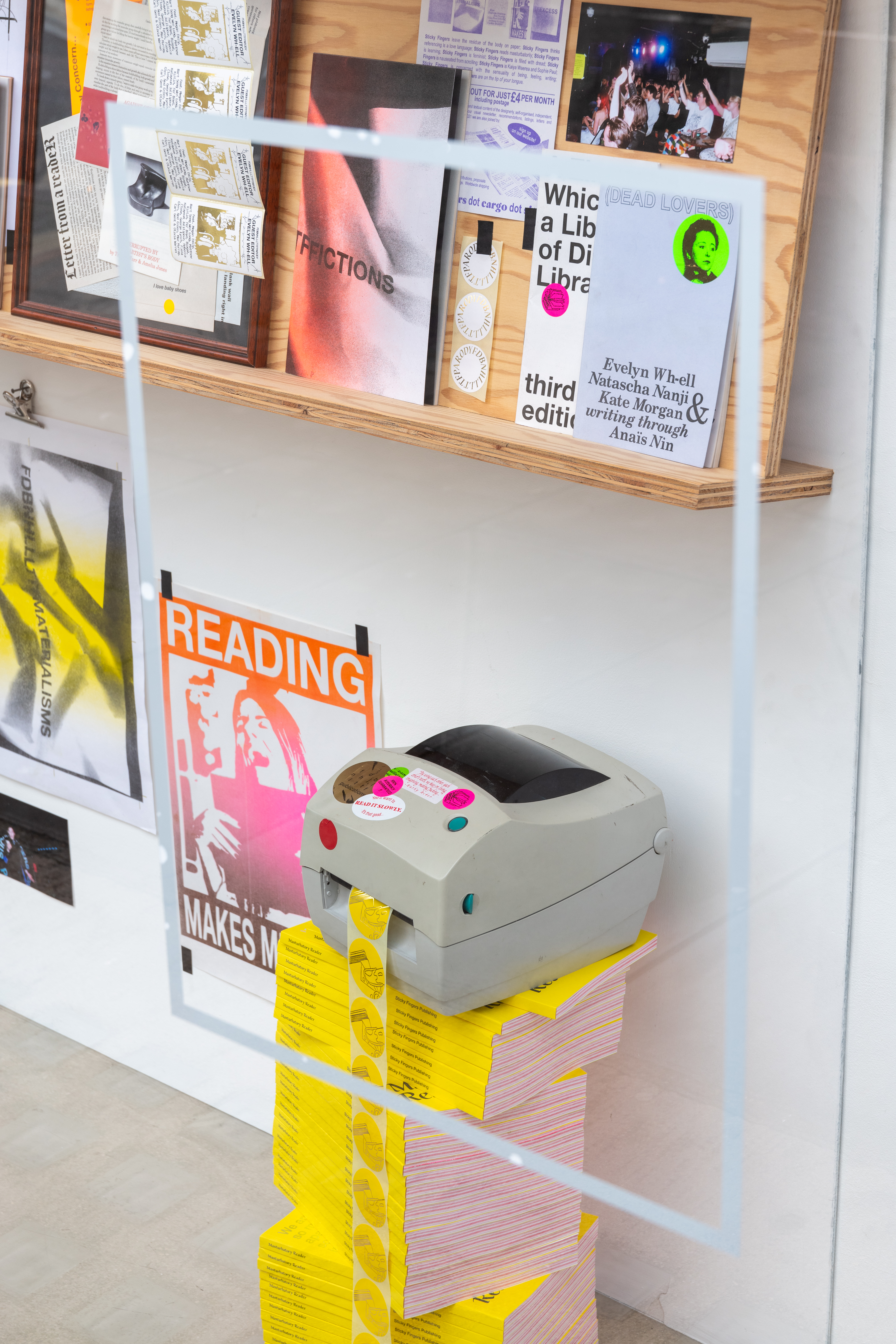 ‘Five Years of Sticky Fingers Publishing’ was a retrospective of the first five years of Sticky Fingers Publishing’s activities, and was shown as Maximillian William Gallery’s window exhibition ‘The Shelf’. The display included our whole back-catalogue of publications, a monthly risograph printed mail out, event ephemera such as posters and flyers, test prints, the residue of party games, open call posters, fair signage and our banner, stickers, film photographs, studio notes and lists.