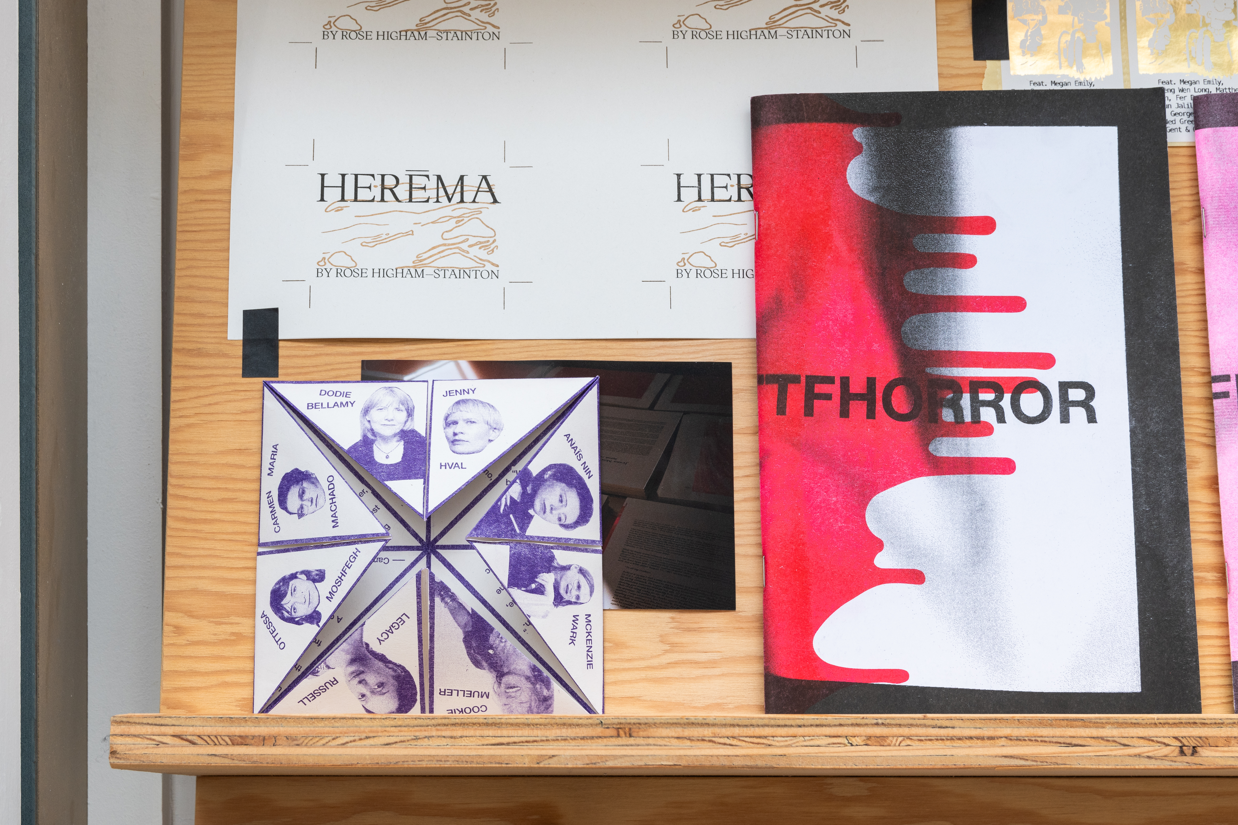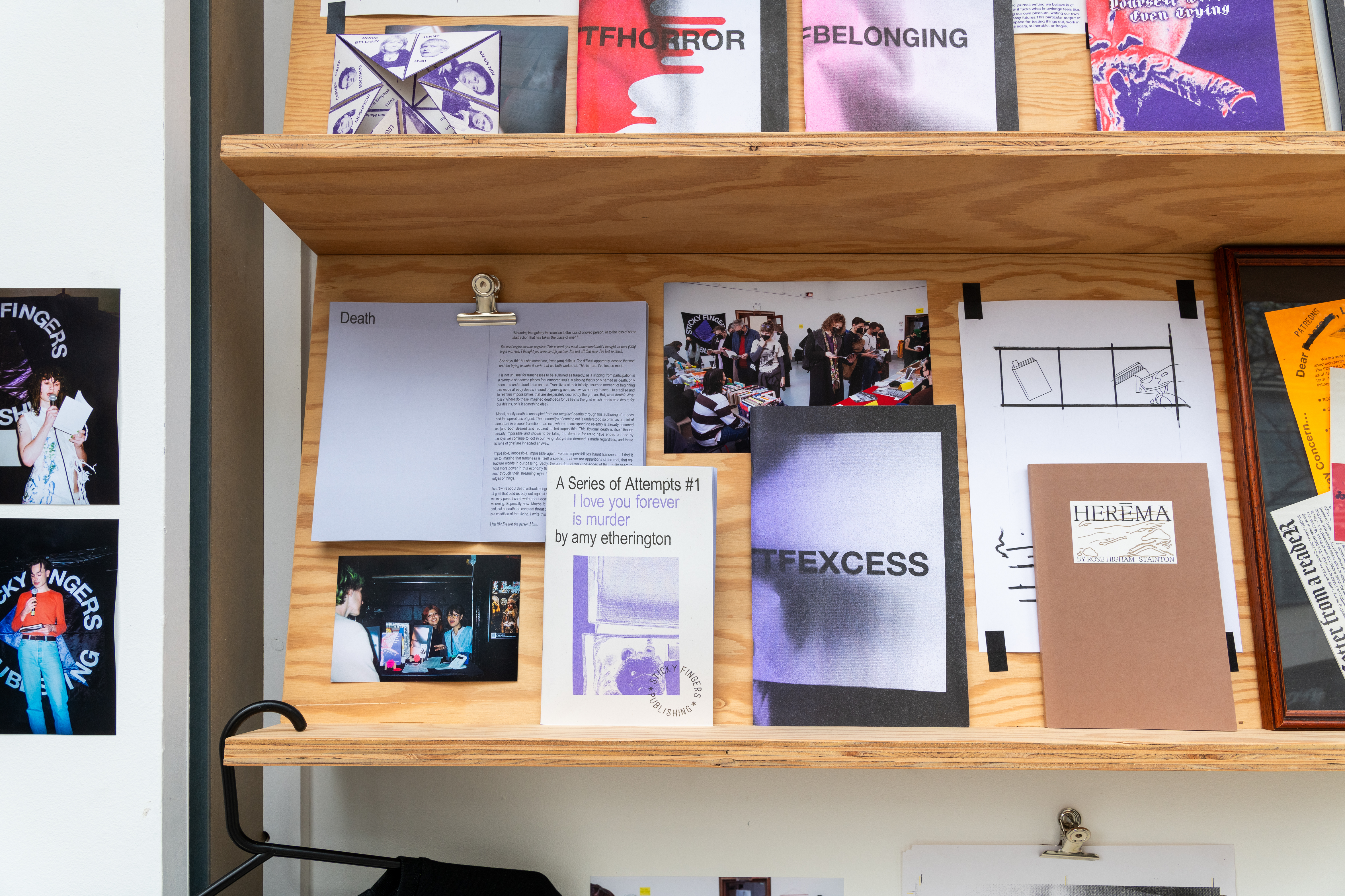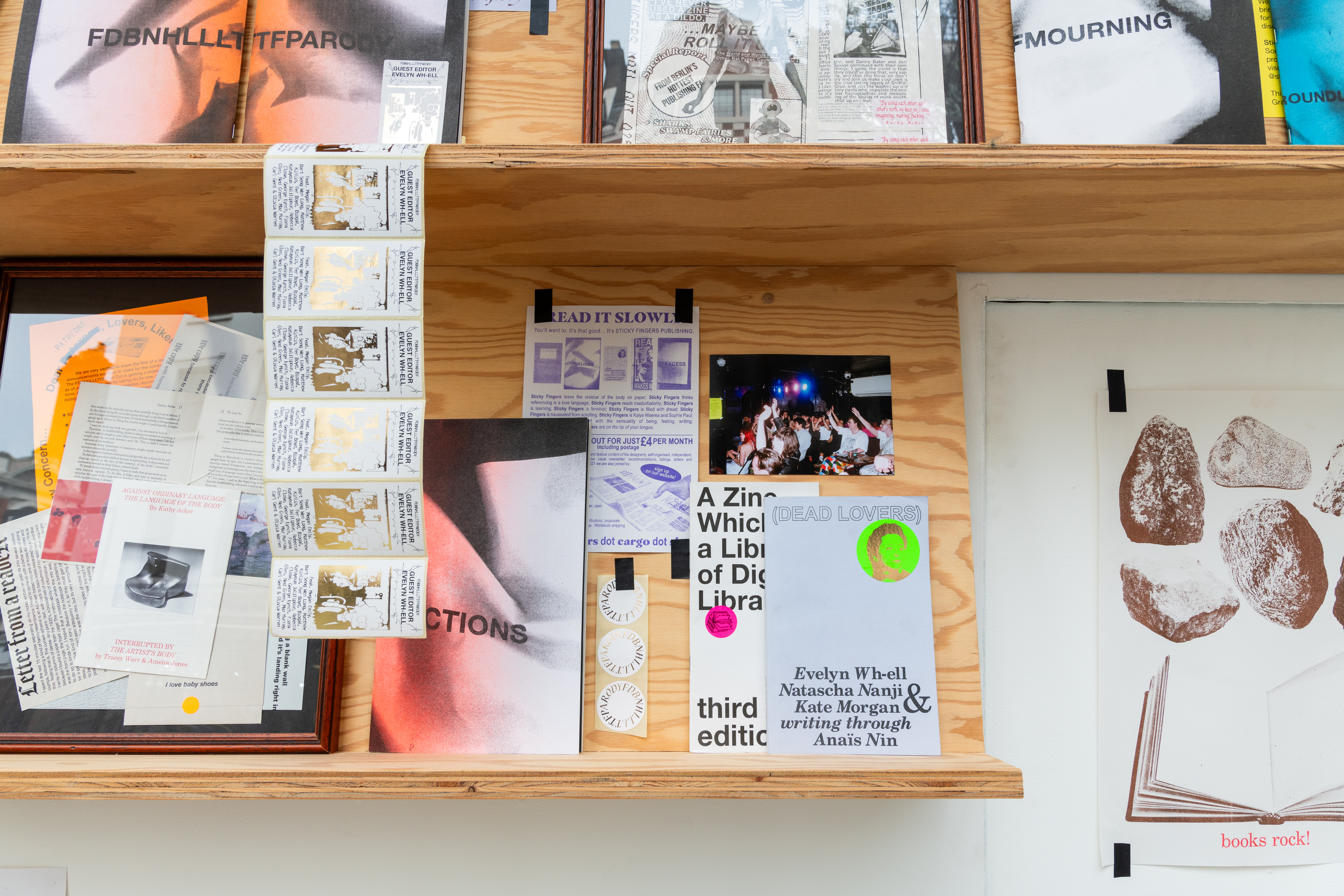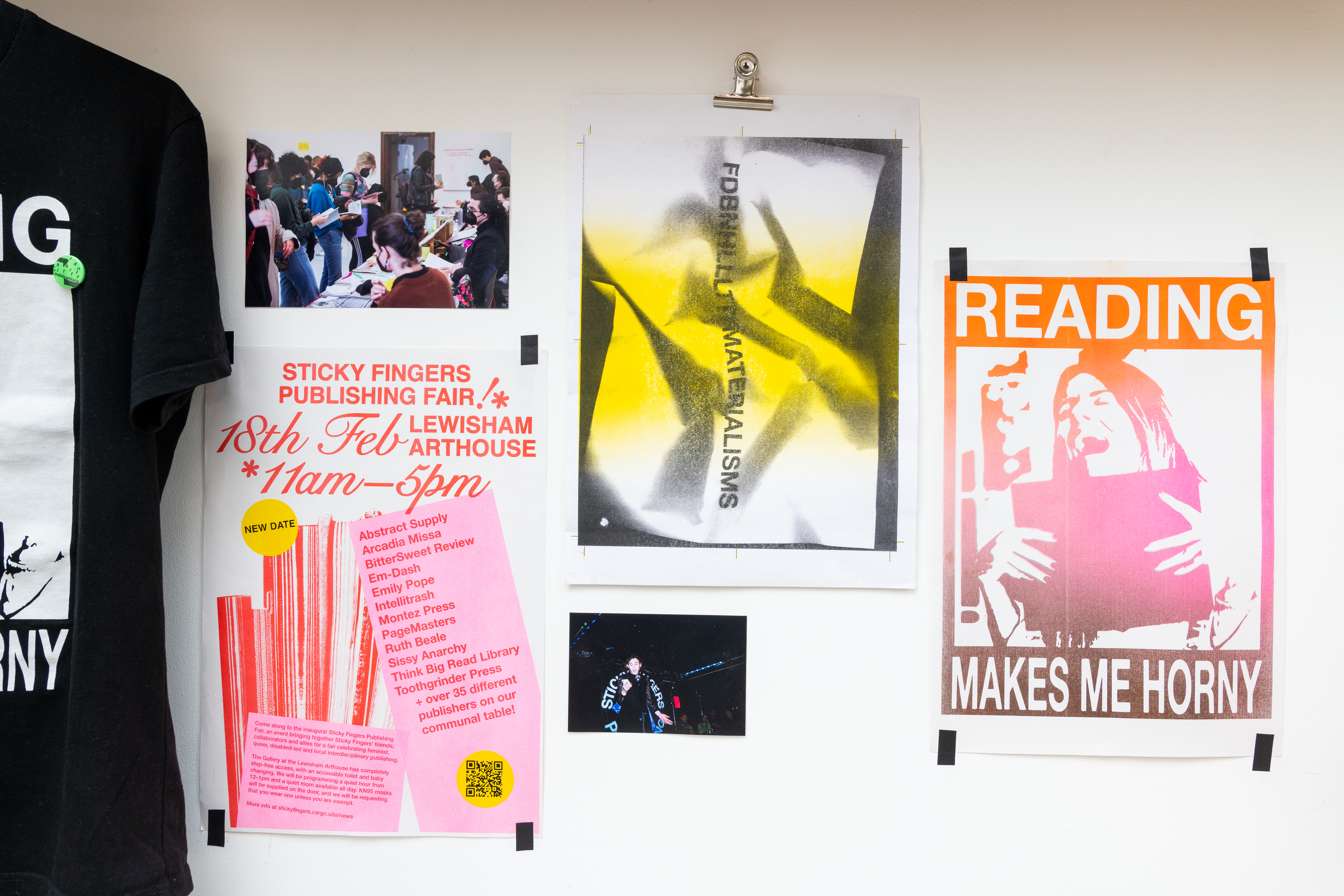‘Five Years of Sticky Fingers Publishing’ was a retrospective of the first five years of Sticky Fingers Publishing’s activities, and was shown as Maximillian William Gallery’s window exhibition ‘The Shelf’. The display included our whole back-catalogue of publications, a monthly risograph printed mail out, event ephemera such as posters and flyers, test prints, the residue of party games, open call posters, fair signage and our banner, stickers, film photographs, studio notes and lists.