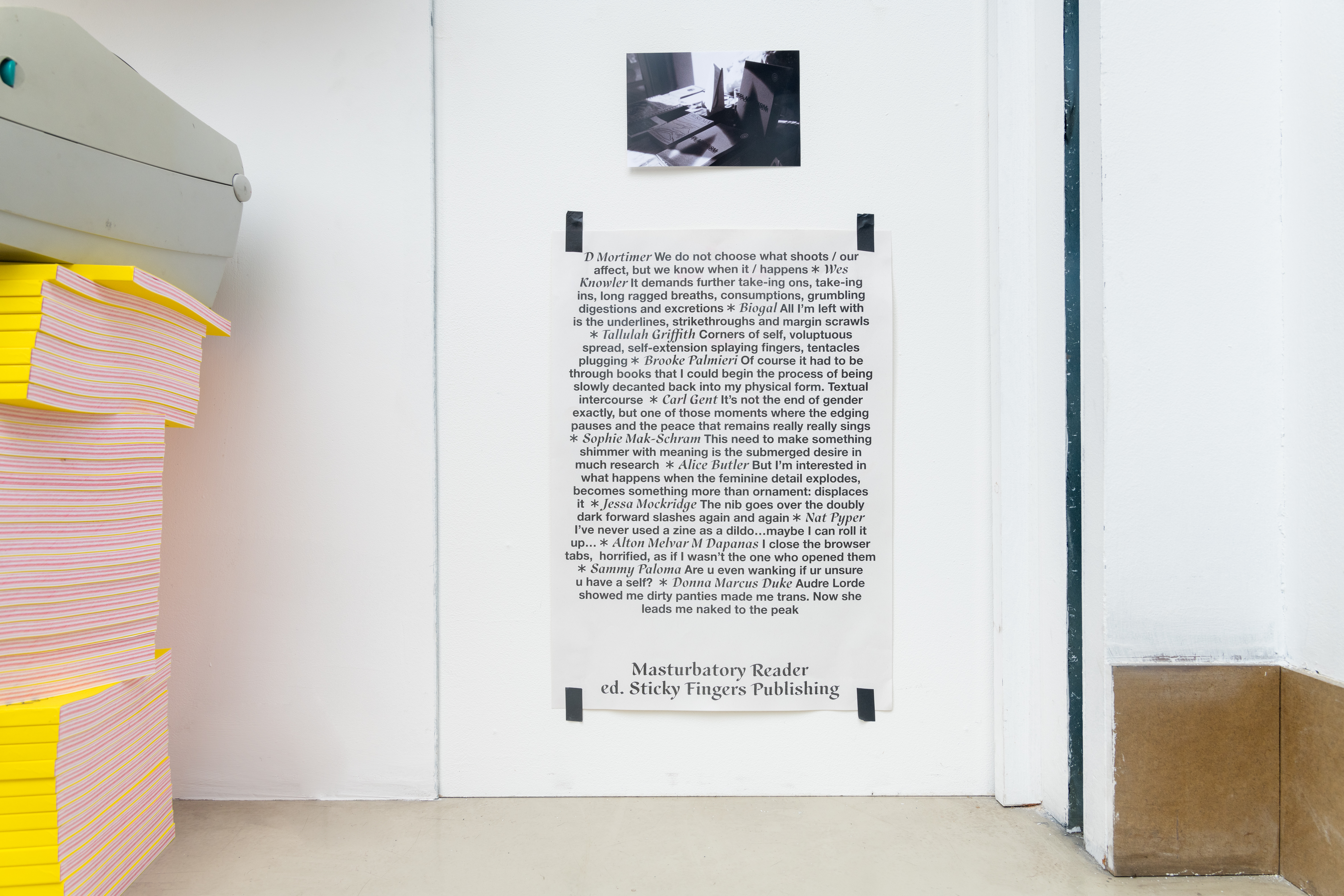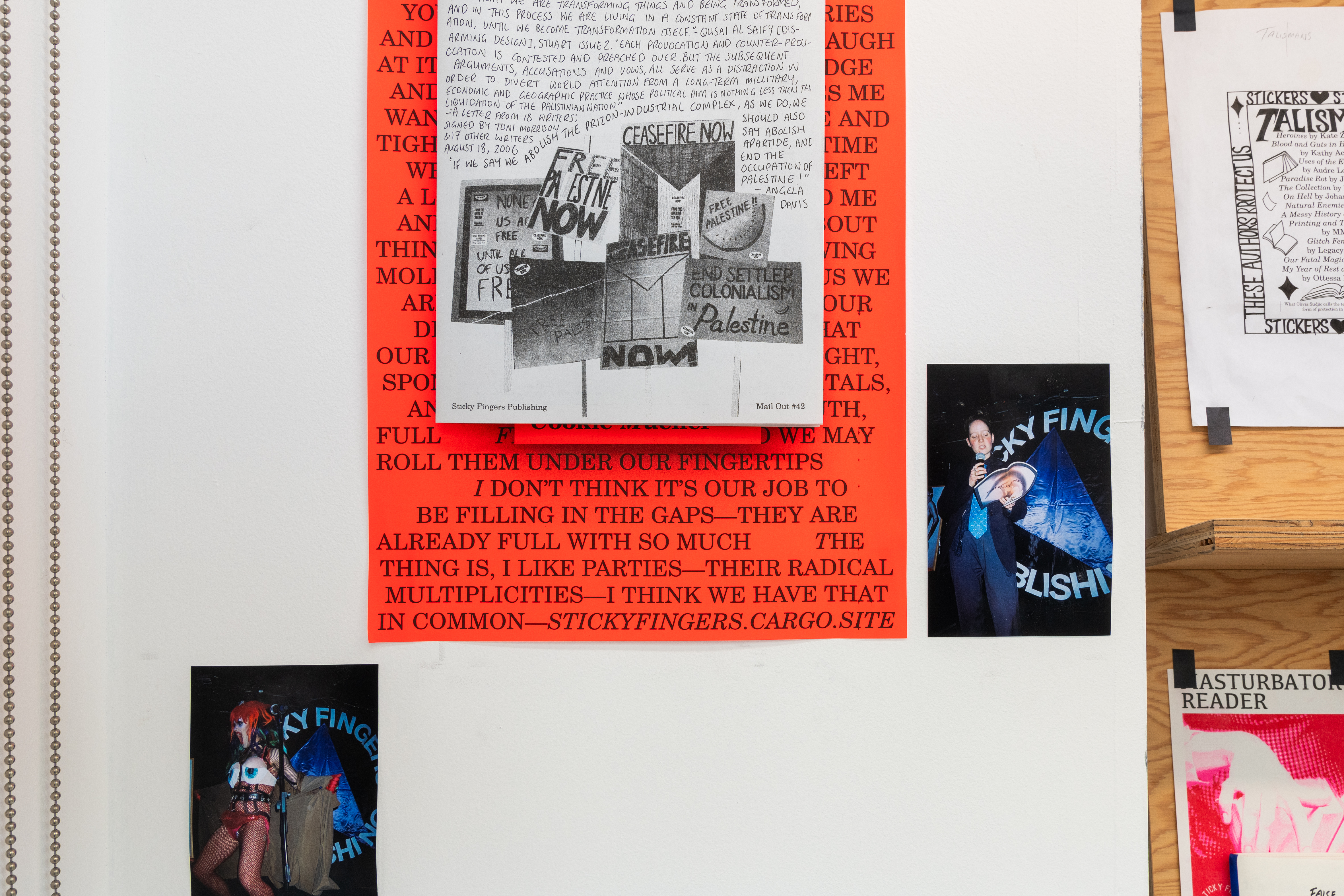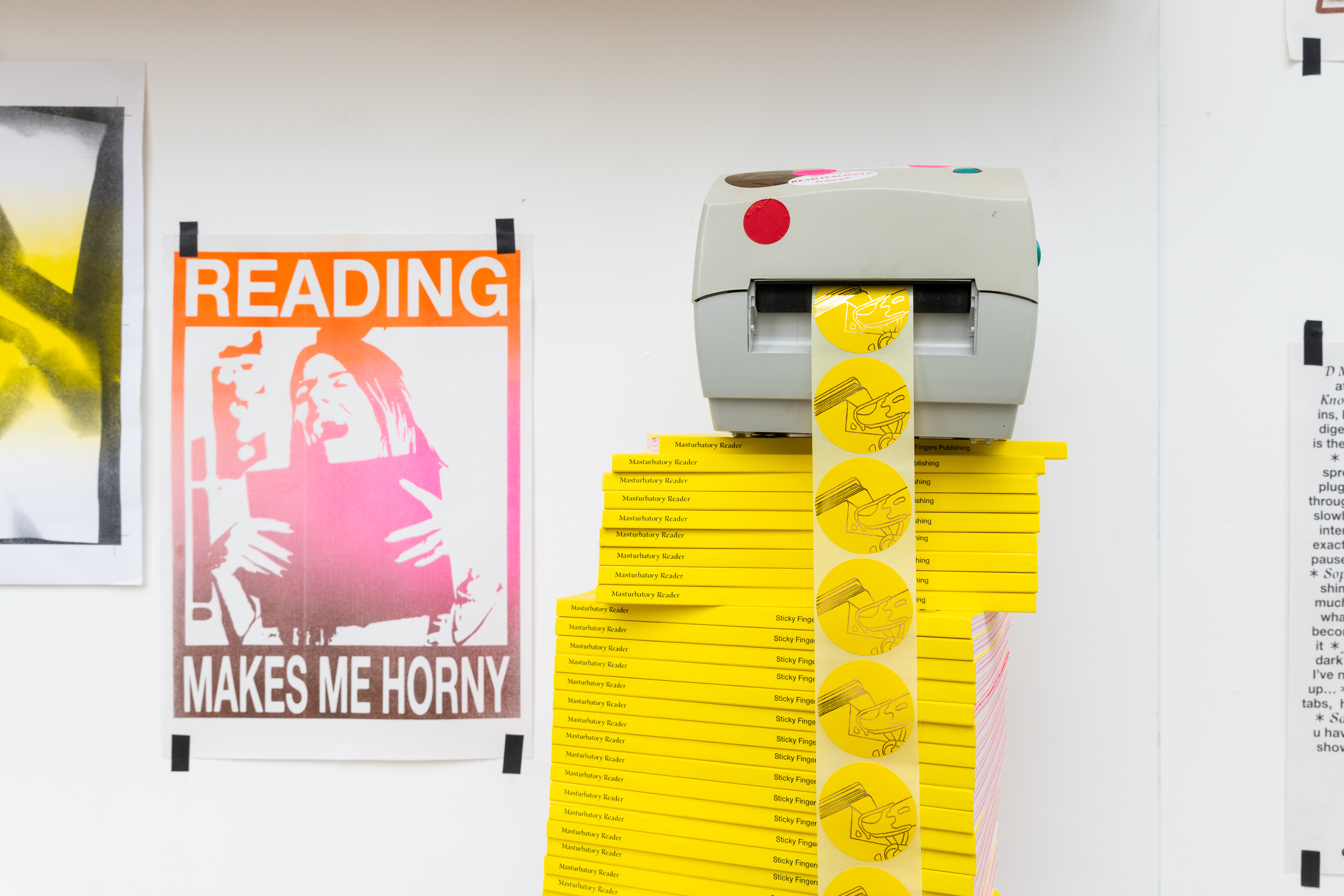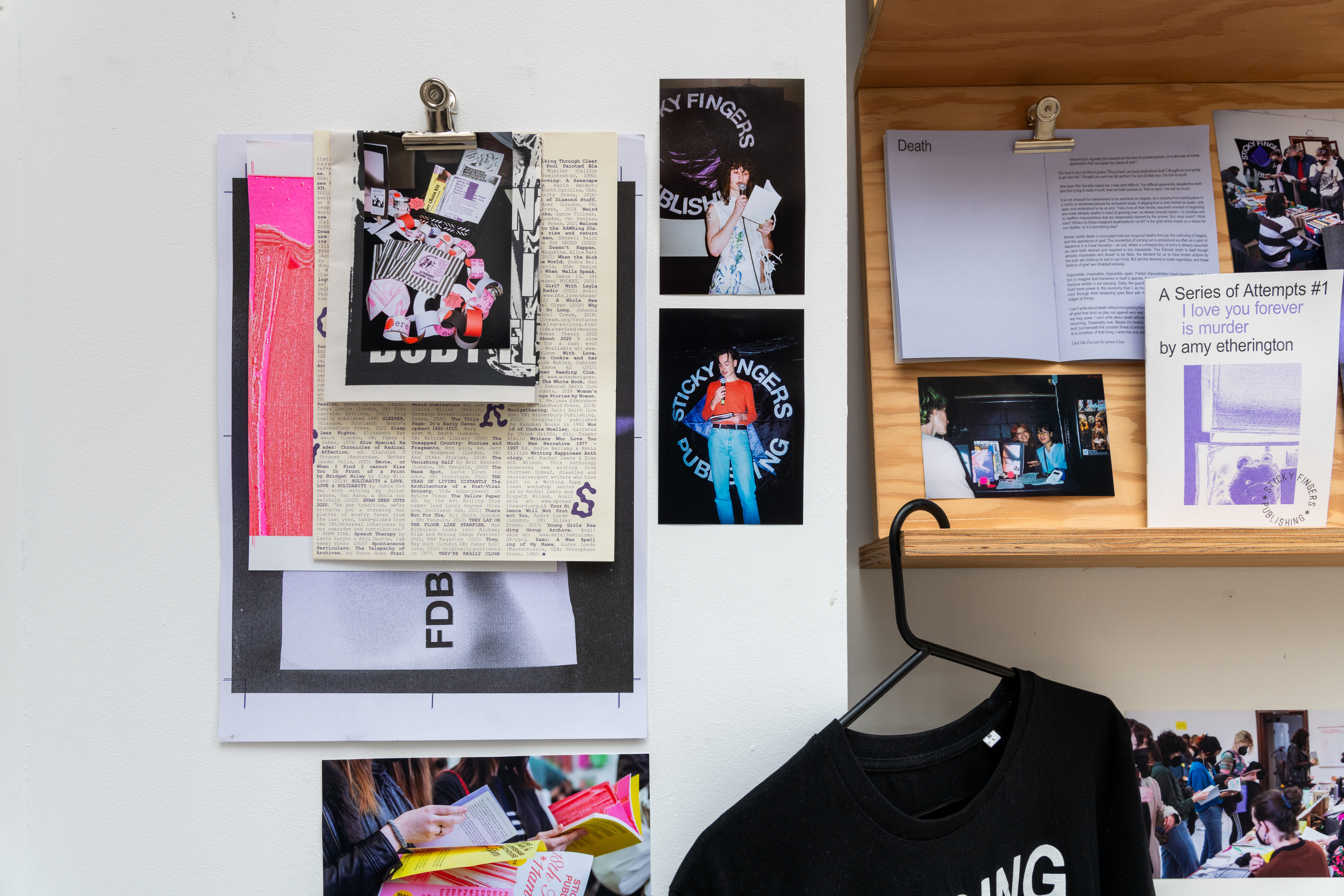 ‘Five Years of Sticky Fingers Publishing’ was a retrospective of the first five years of Sticky Fingers Publishing’s activities, and was shown as Maximillian William Gallery’s window exhibition ‘The Shelf’. The display included our whole back-catalogue of publications, a monthly risograph printed mail out, event ephemera such as posters and flyers, test prints, the residue of party games, open call posters, fair signage and our banner, stickers, film photographs, studio notes and lists.